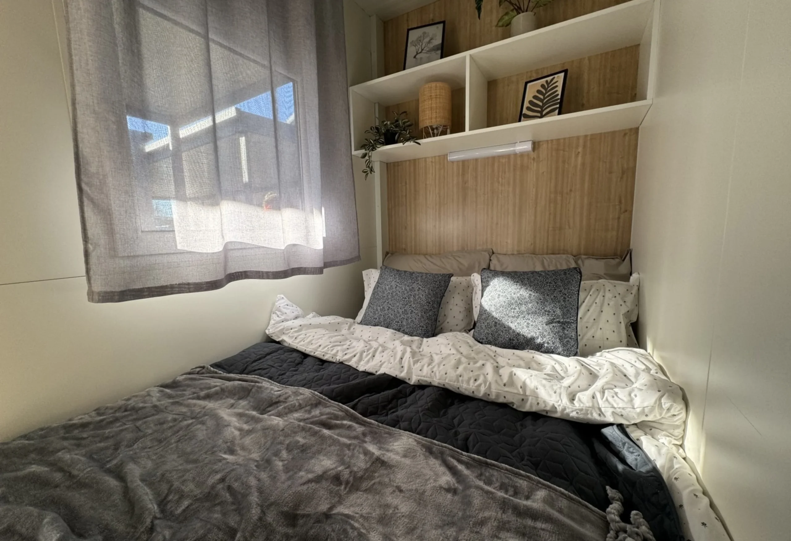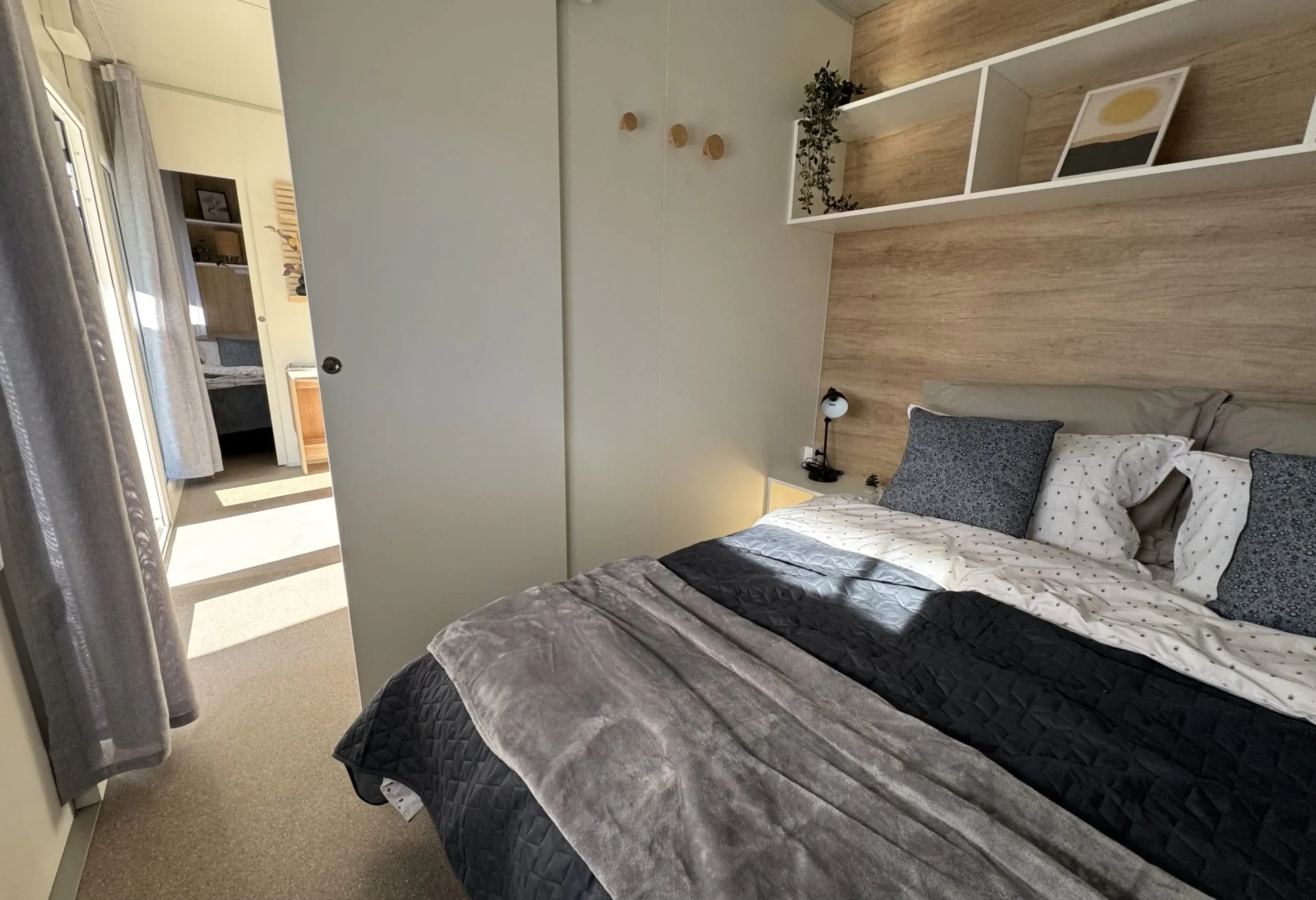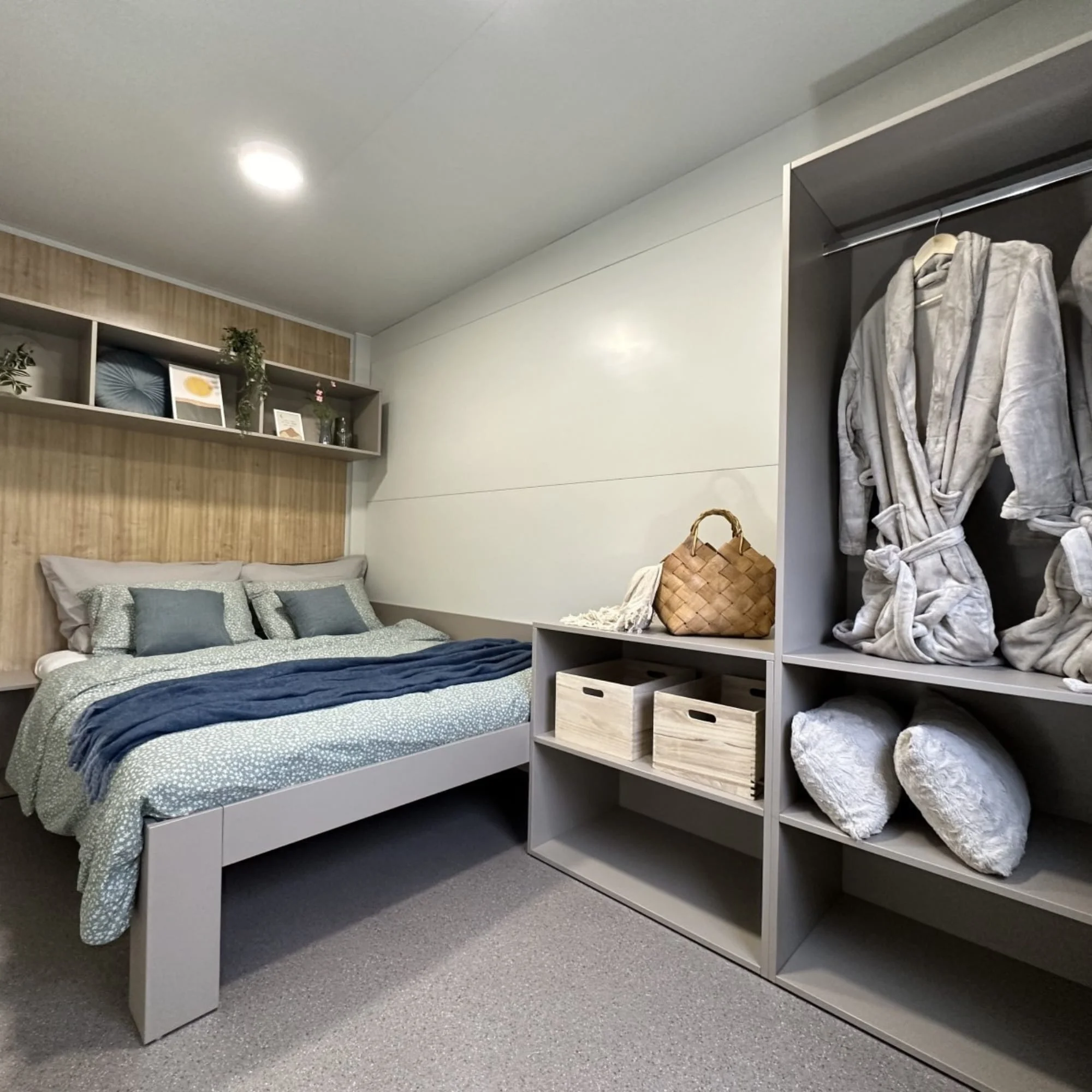 Łóżko podwójne, wygodne materace, szafa oraz półki do przechowywania.