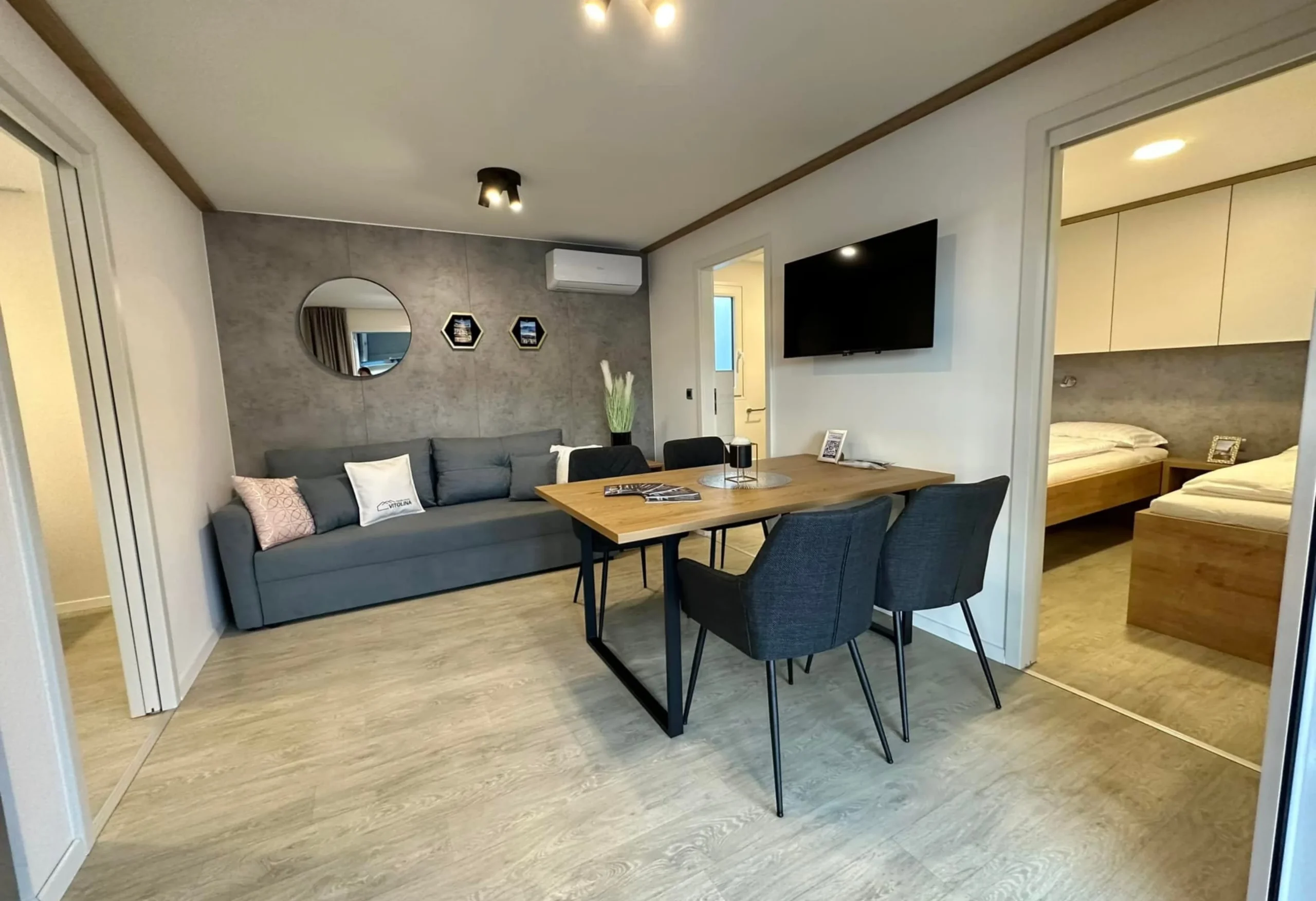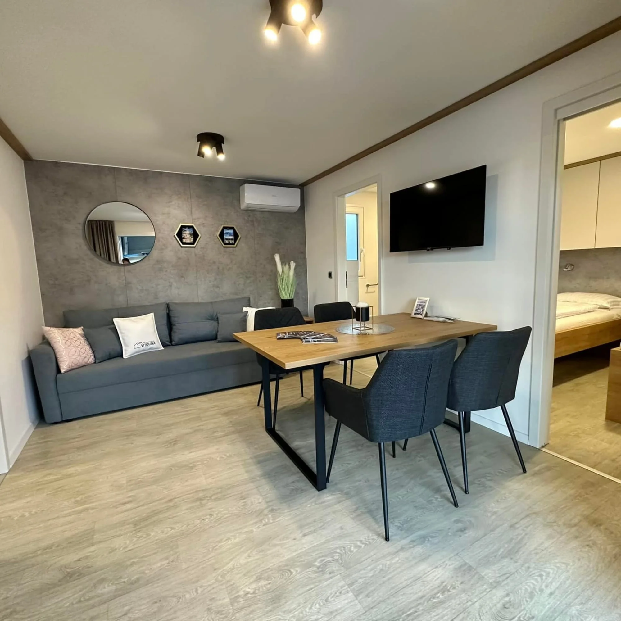 Aneks kuchenny z meblami i płytą grzewczą, lodówka, bojler, stół, sofa, telewizor oraz klimatyzacja – wszystko, czego goście potrzebują do komfortowego pobytu.